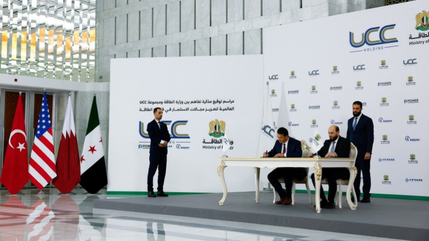 شهد قصر الشعب في دمشق اليوم مراسم توقيع مذكرات تفاهم بين وزارة الطاقة السورية وتحالف دولي بقيادة شركة "أوروباكون القابضة" (UCC) وعدد من الشركات العالمية، وذلك بحضور الرئيس السوري أحمد الشرع.