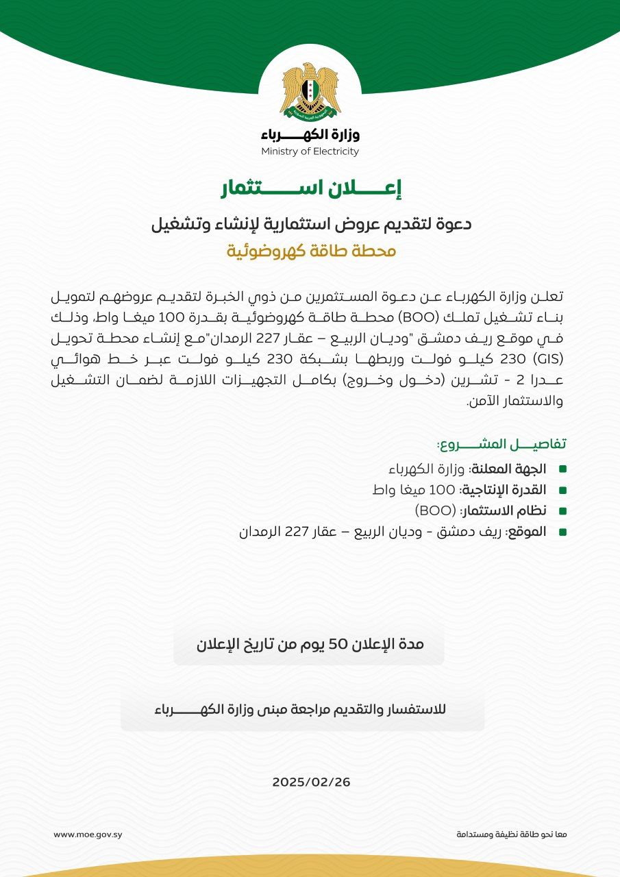 Media Center Ministry of Electricity announces experienced… 2025-03-02 Ministry of Electricity announces experienced investors to submit their offers for… General Director of Public Establishment for… 2025-02-20 General Director of Public Establishment for Transmission and Distribution of Electricity… Minister of Electricity Engineer Omar Shakrouq 2025-01-26 Minister of Electricity Engineer Omar Shakrouq made a tour for "Dair Ali" power… Minister of Electricity,eng Omar Shagrouk 2025-01-23 Minister of Electricity,eng Omar Shagrouk discussed with David Bode… General Director of public Establishment for… 2025-01-13 General Director of public Establishment for Electricity Transmission and Distribution,… Ministry of Electricity in discussions with UNDP 2024-12-30 Ministry of Electricity engaged in discussions with the United Nations Development Program.… Pagination First page « الأول Previous page ‹ السابق Page 1 Page 2 Current page 3 Page 4 Next page التالي › Last page الأخير » Download Mobile Application Related government websites http://www.dec.gov.sy/ http://peeg.gov.sy/ http://www.nerc.gov.sy/ http://www.moe.gov.sy/